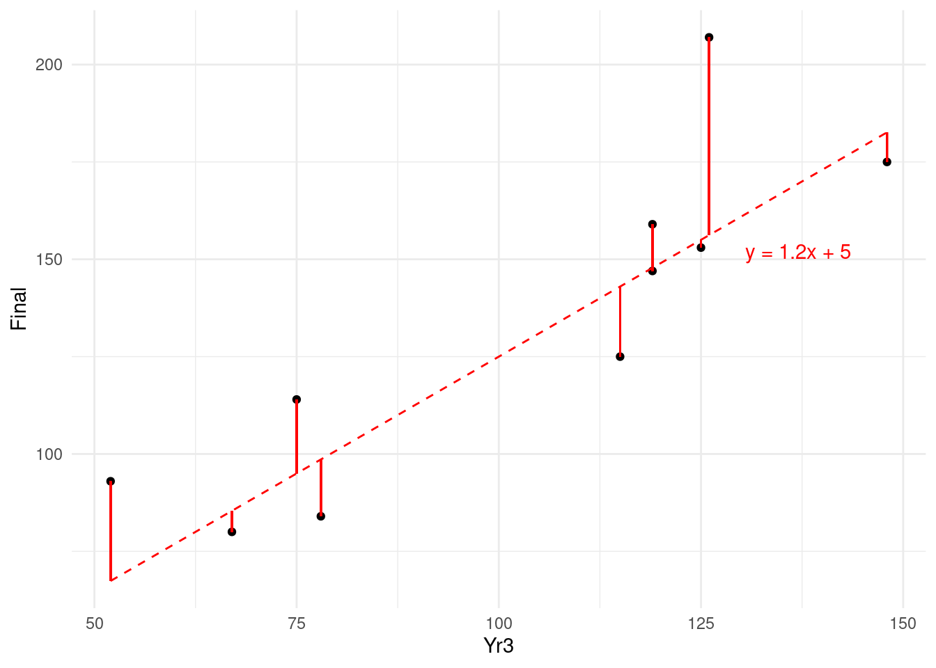 Now let’s assume that we have a sample of 10 observations with which to estimate our linear relationship. Let’s take the first 10 values of Yr3 and Final in our ugtests data set: