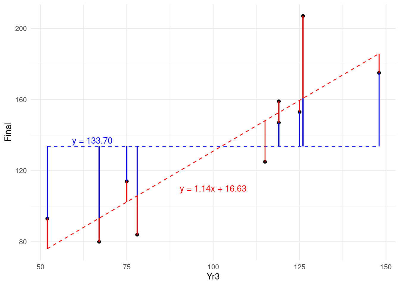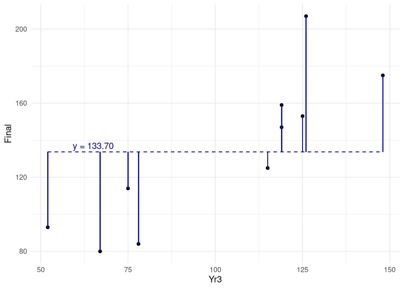 One natural way to benchmark how good a job your model does of explaining the outcome is to compare it to a situation where you have no input and no model at all. In this situation, all you have is your outcome values, which can be considered a random variable with a mean and a variance. In the case of our 10 observations, we have 10 values of Final with a mean of 133.7. We can consider the horizontal line representing the mean of \(y\) as our ‘random model’, and we can calculate the residuals around the mean. This can be seen in Figure 4.6.