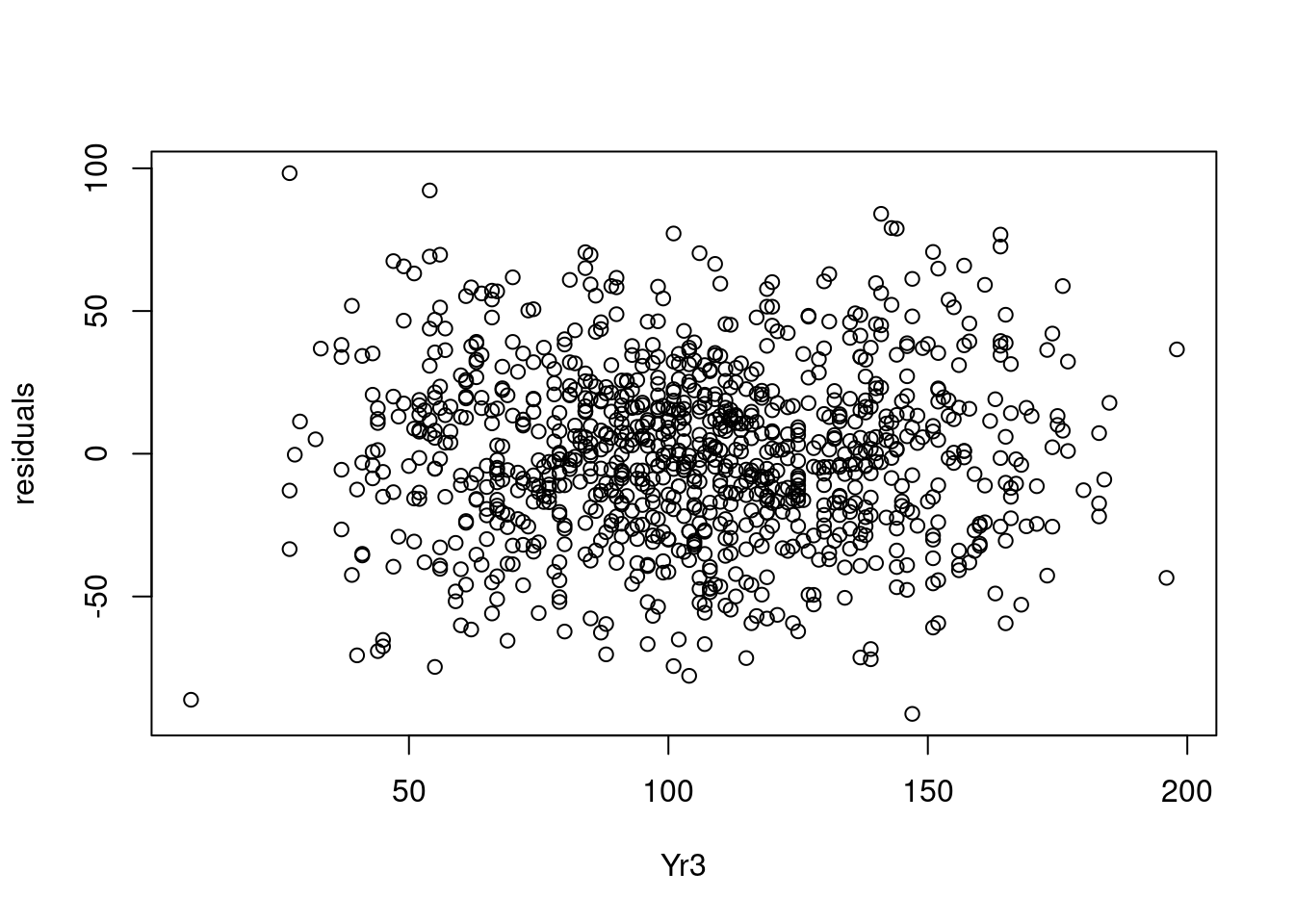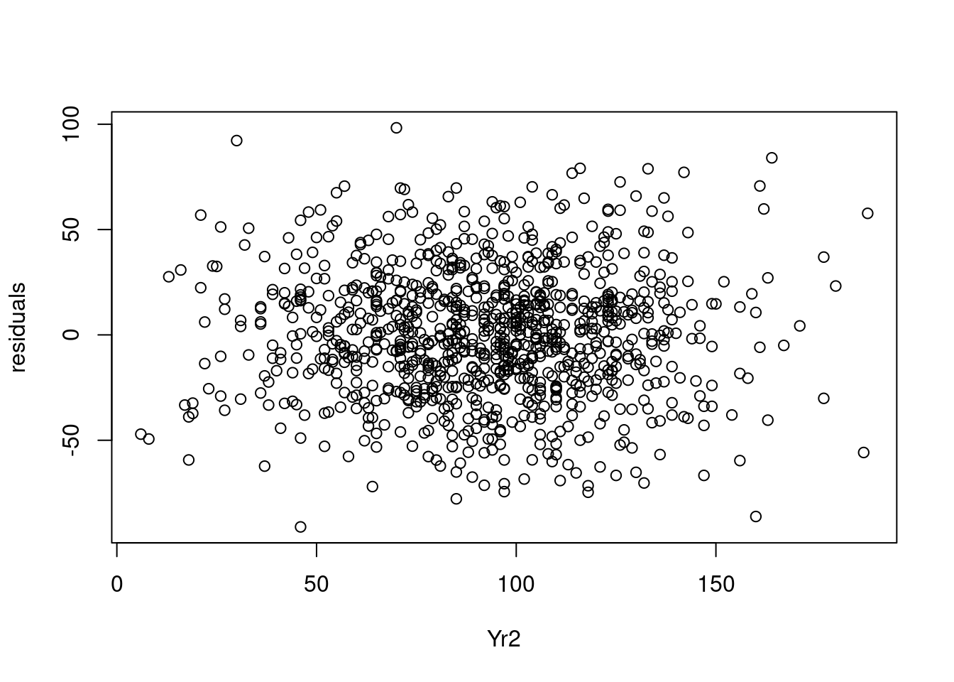 In this case we find that modeling Yr1 as a quadratic makes no difference to the fit of the model.