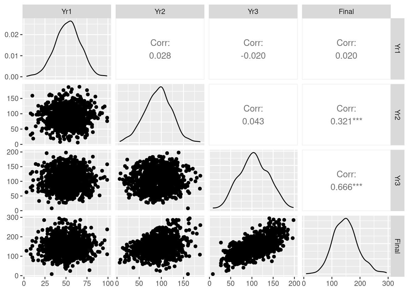 In the diagonal, we can see the distributions of the data in each column. We observe relatively normal-looking distributions in each year. We can see scatter plots and pairwise correlation statistics off the diagonal. For example, we see a particularly strong correlation between Yr3 and Final test scores, a moderate correlation between Yr2 and Final and relative independence elsewhere.