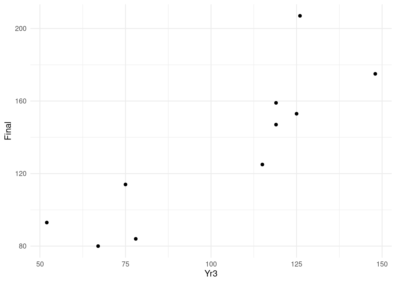 (d <- head(ugtests[ , c("Yr3", "Final")], 10)) Yr3 Final