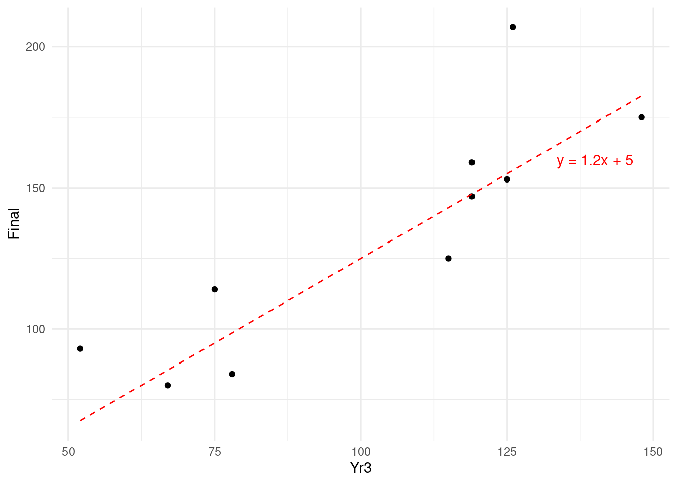 First we need to express the model we are looking to calculate as a formula. In this simple case, we want to regress the outcome \(y =\) Final against the input \(x =\) Yr3, and therefore we would use the simple formula notation Final ~ Yr3. Now we can use the lm() function to calculate the linear model based on our data set and our formula.