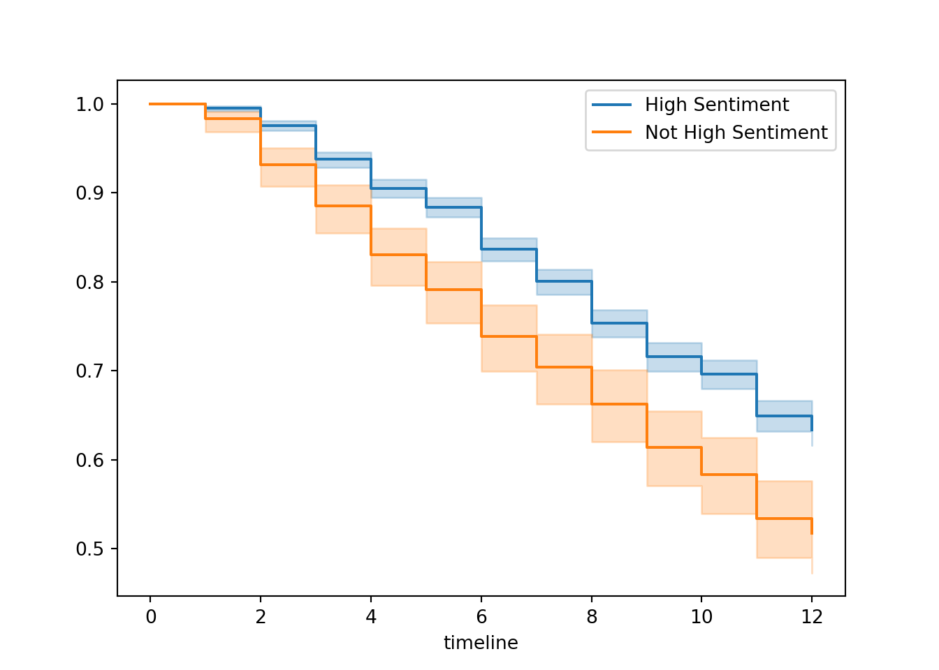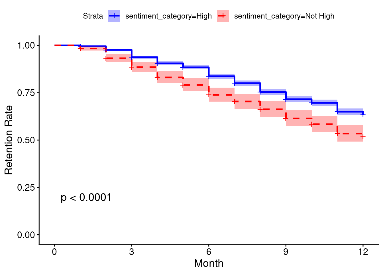 This confirms that the survival difference between the two sentiment groups is statistically significant and provides a highly intuitive visualization of the effect of sentiment on retention throughout the period of study.