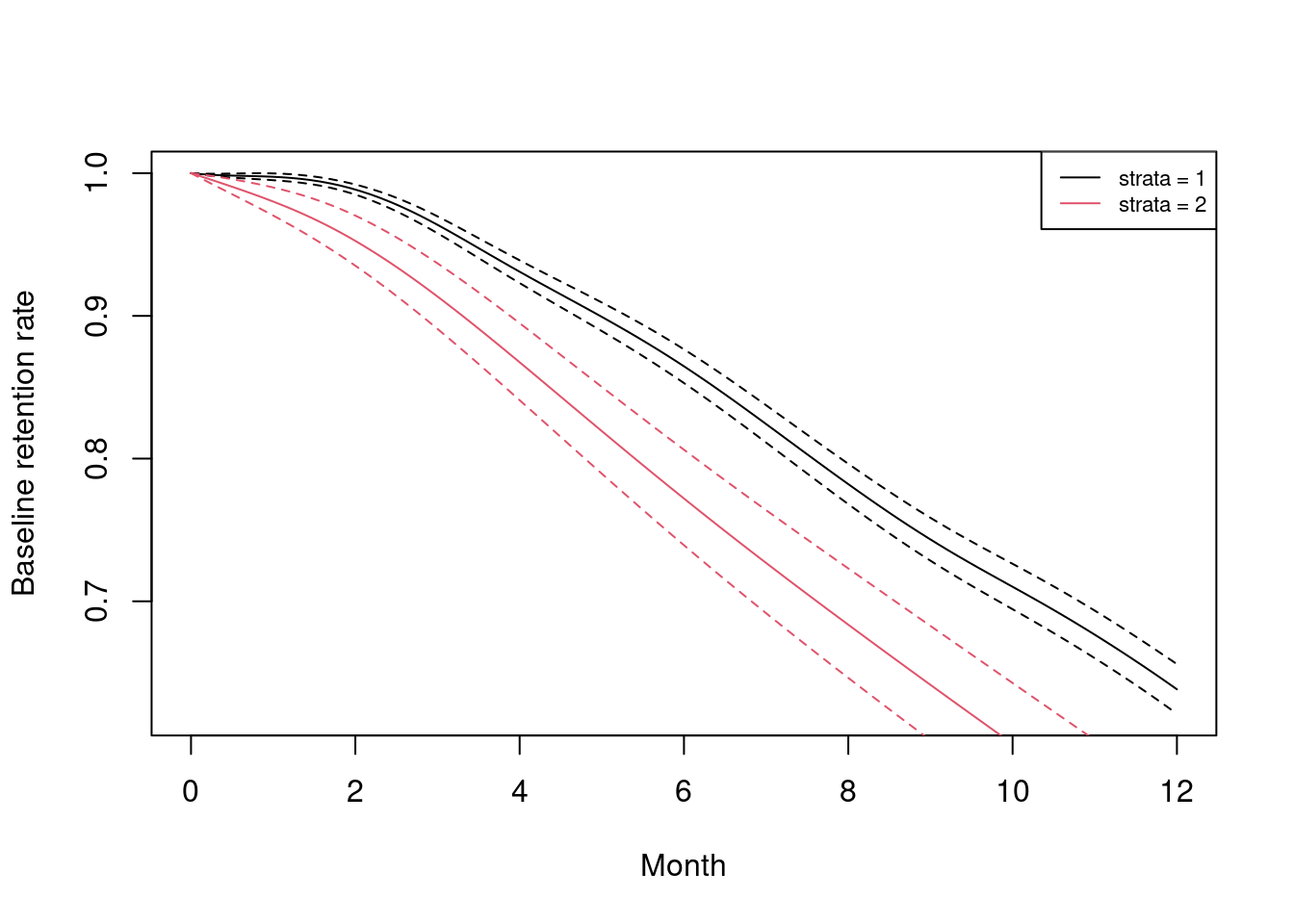 The frailtyPenal() function can also be a useful way to observe the different baseline survivals for groups in the data. For example, a simple stratified Cox proportional hazard model based on sentiment category can be constructed2.